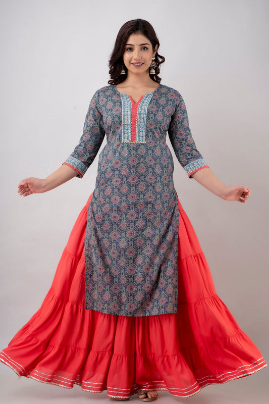 Ethnic Set Women Printed and Embroidered Kurta and Sharara Set with Dupatta