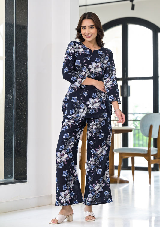 Anam Ethnic Set Floral Printed Navy Blue Co-ord Set