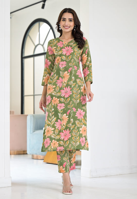 Anam Ethnic Set Floral Printed Green Co-ord Set