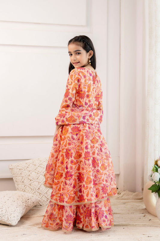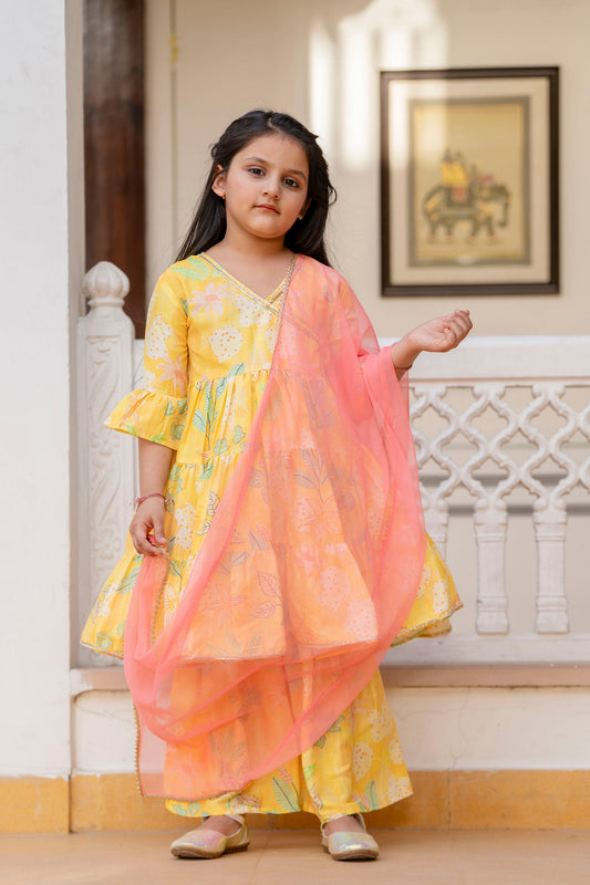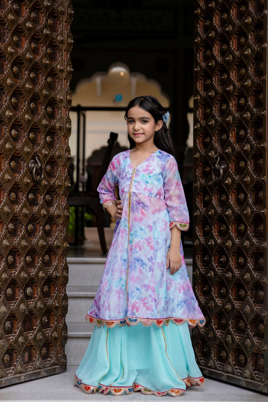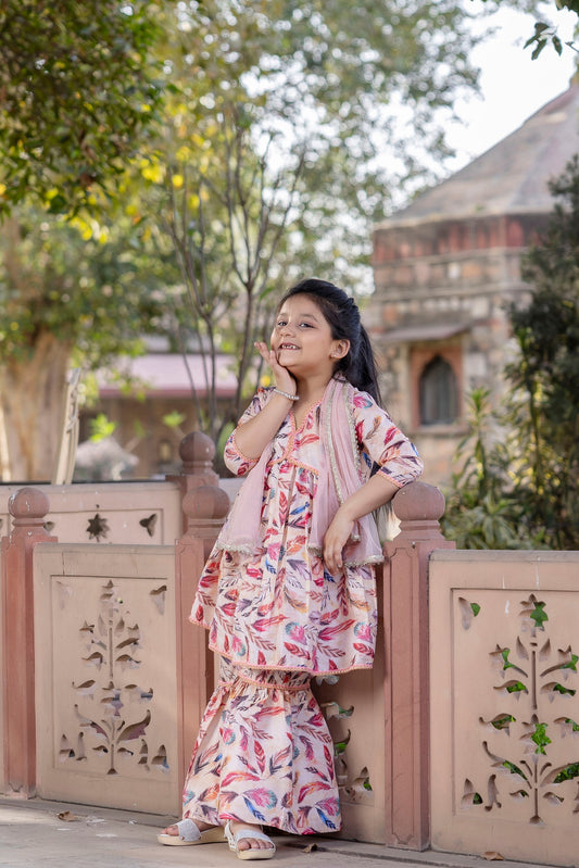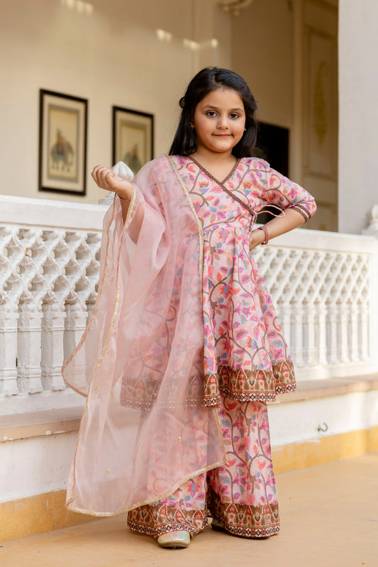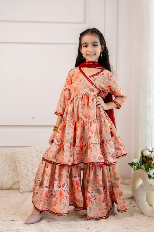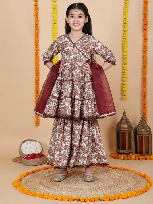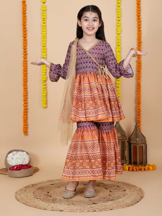 Girls' Festive Printed Angrakha Kurta & Sharara with Dupatta