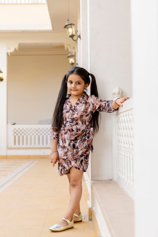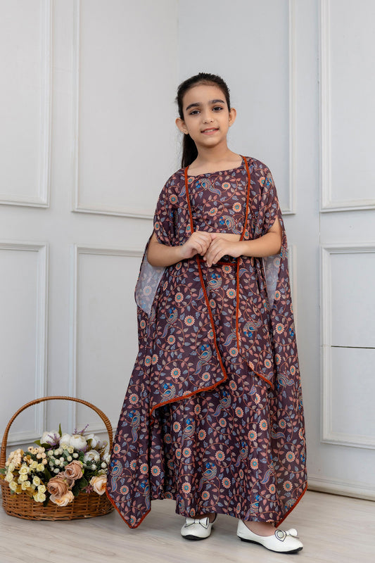 Girls Peacock Print Top and Skirt With Shrug in Brown