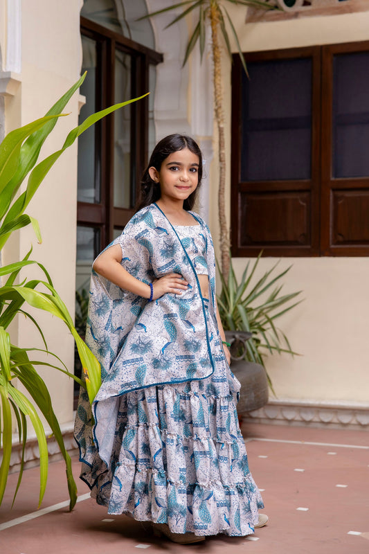 Girls' Peacock Print Top & Skirt with Stylish Shrug