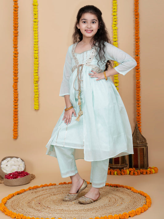 Girls Festive Shrug with Kurta and Pant Set in Aqua Blue