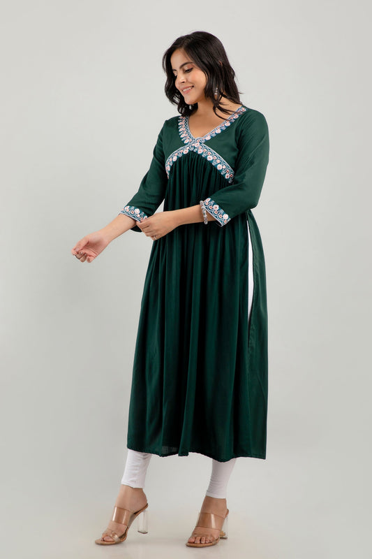 Anam jaipuri Embroidered Aliya Cut Kurta in Dark Green