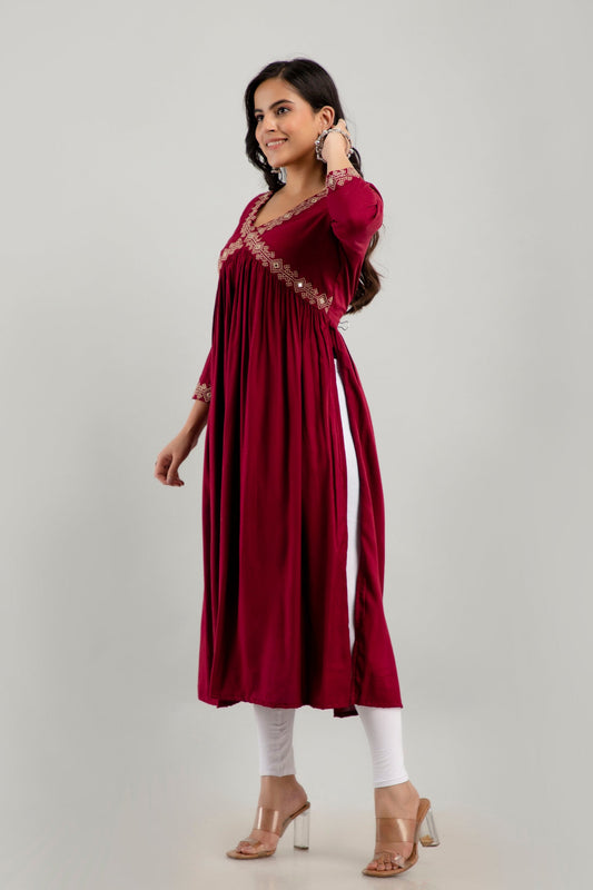 Anam jaipuri Embroidered Aliya Cut Kurta in Maroon