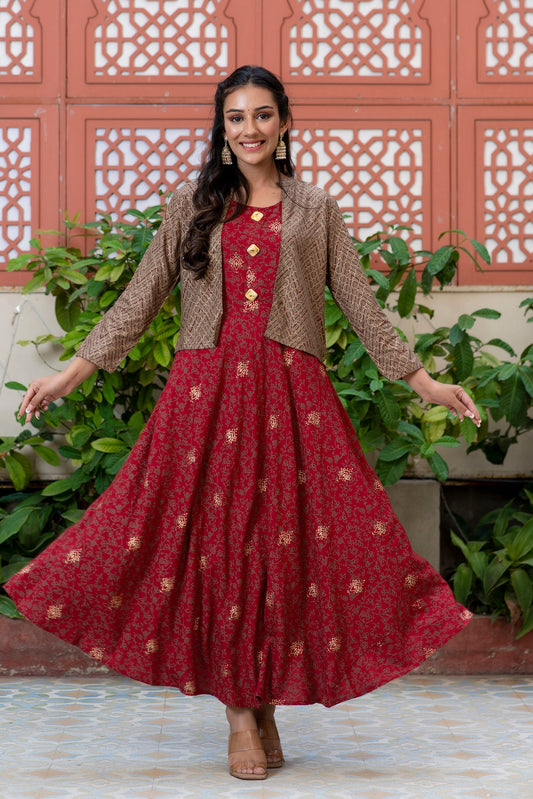 Anam jaipuri Gold Printed Designer Jacket Kurta In Maroon