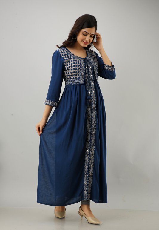 Anam jaipuri Embroidered Jacketed Nyra-Cut Kurta in Dark Blue
