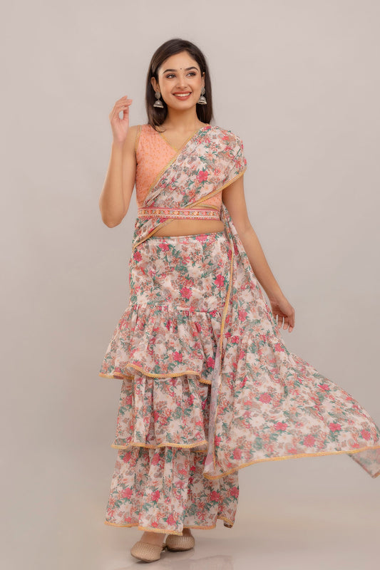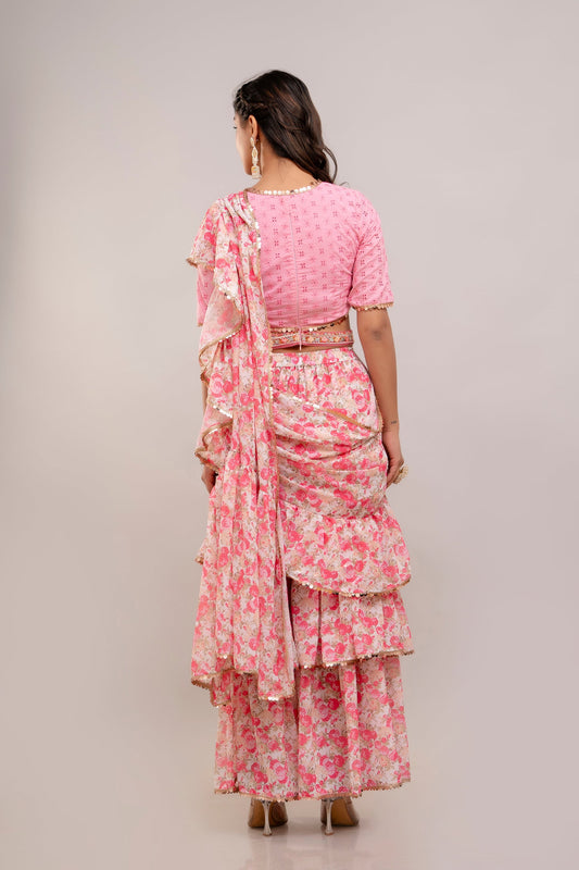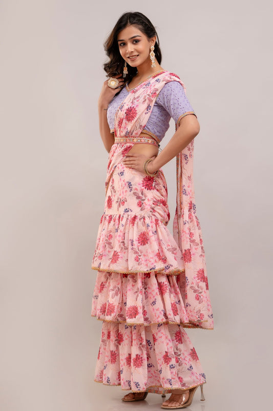 Anam jaipuri Georgette Embroidered Pre Stitched Ruffle Saree With Attach Sleeves