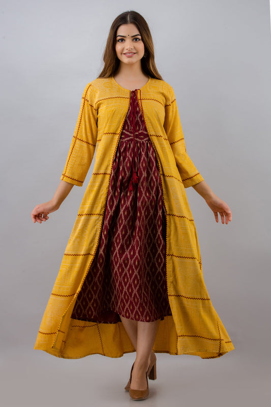 Anam jaipuri Flared Ikkat Kurta & Shrug in Yellow