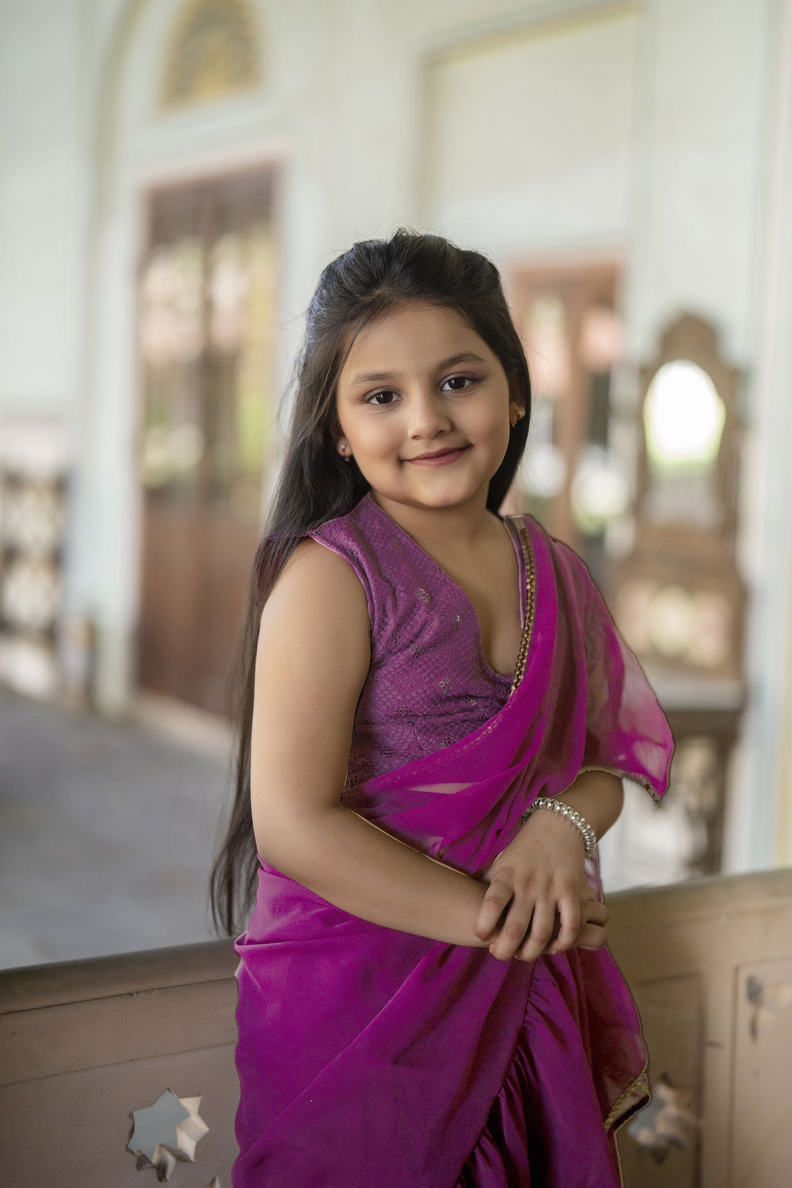 | "Cutie Diva" Girls Wedding wear Georgette Floral Saree with Sequence Blouse & Attached Belt in Dark Pink Colour, sequence Lace will Enhance the Look Of your Diva, your young fashionista will not only look like a traditional princess but also feel comfortable and confident during the festivities. This stunning ensemble embodies the spirit of celebration and tradition, making it a must-have addition to every girl's wardrobe for those special moments that deserve a touch of elegance. |